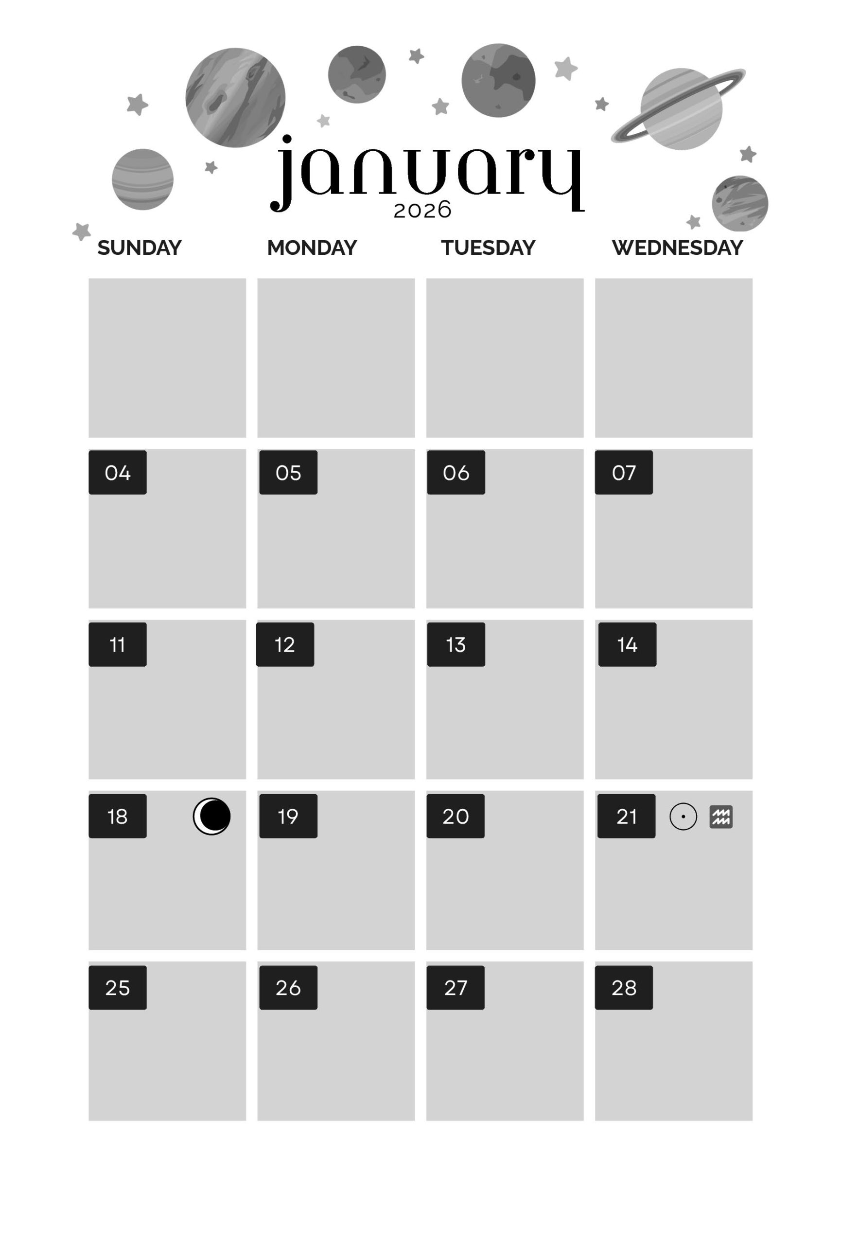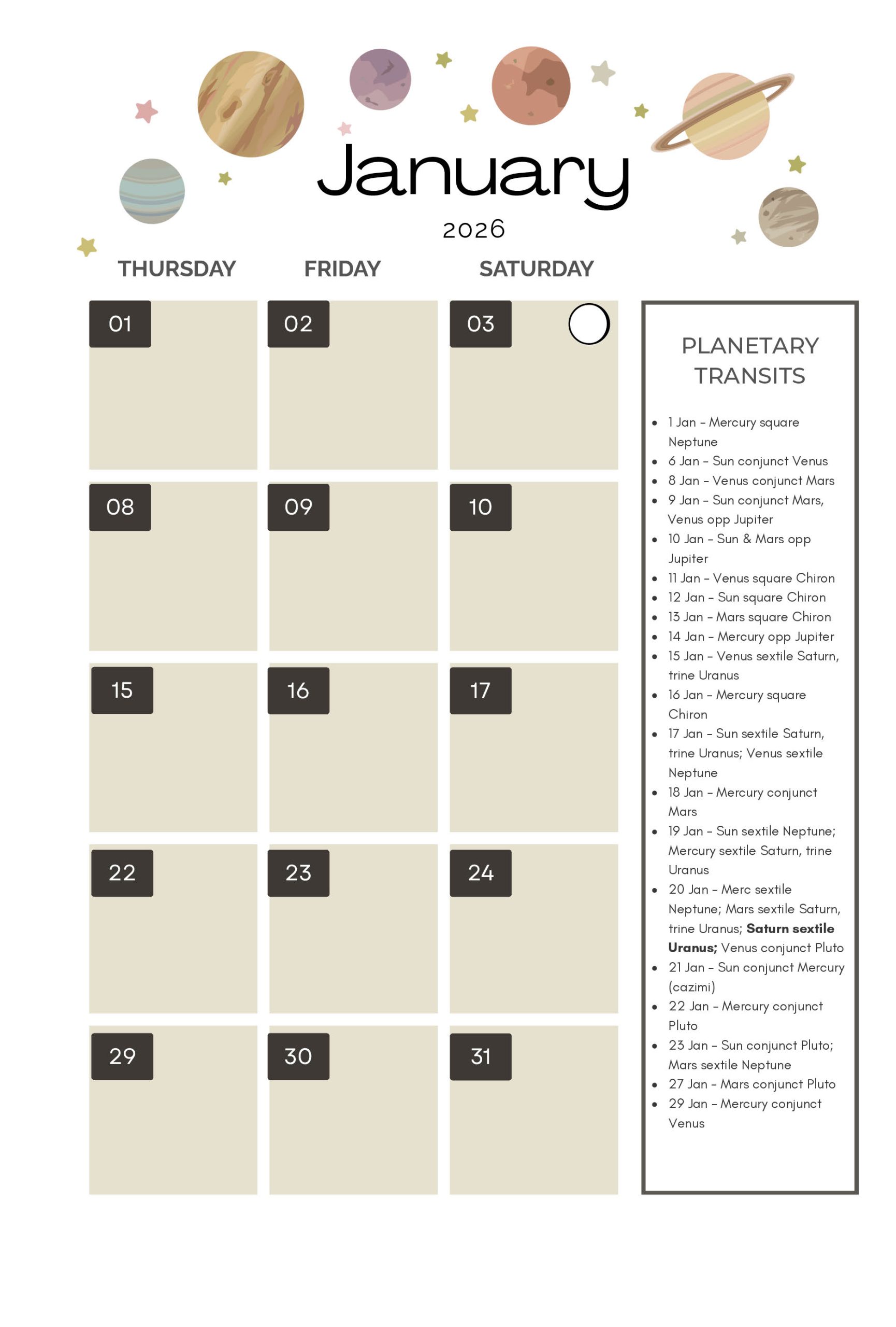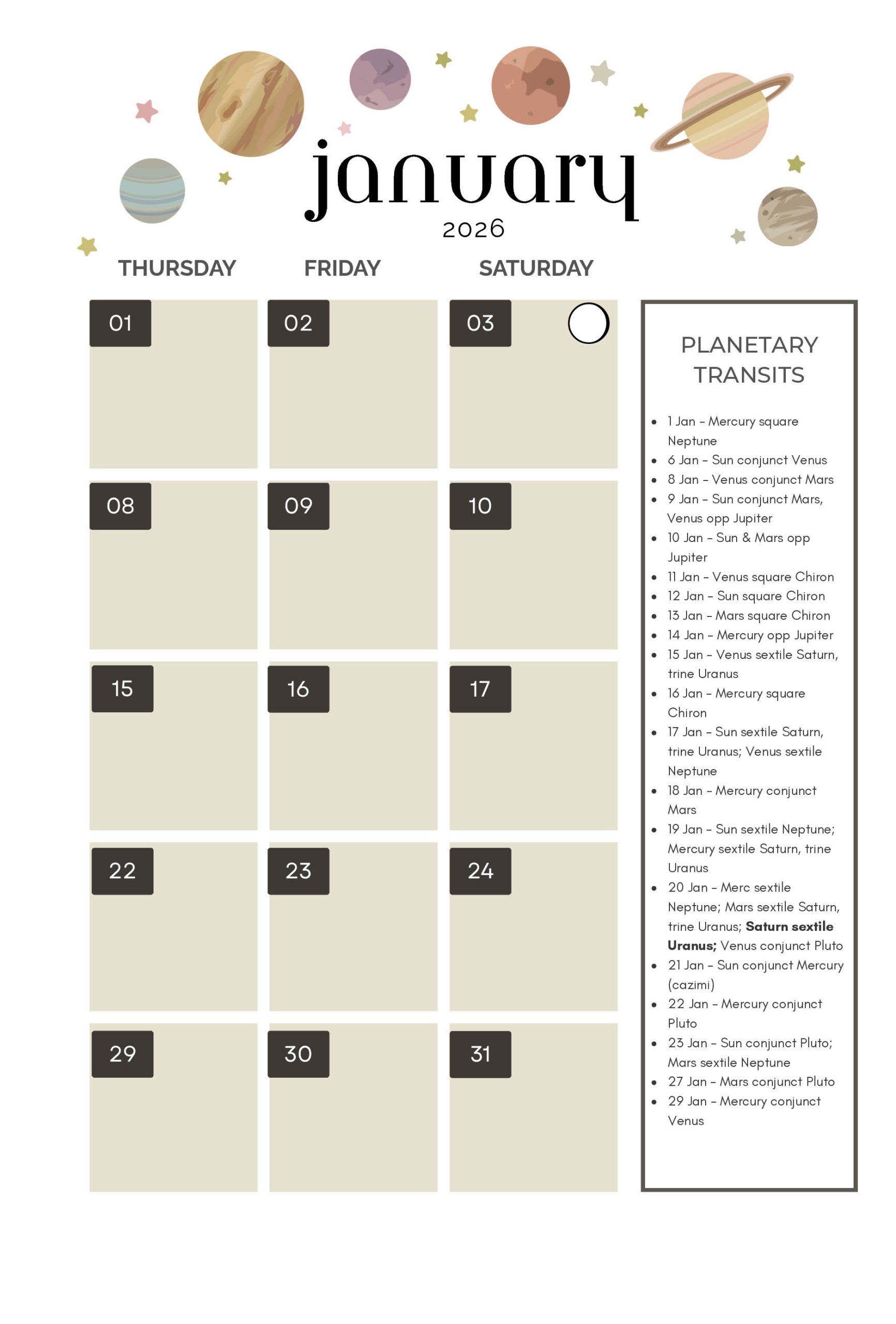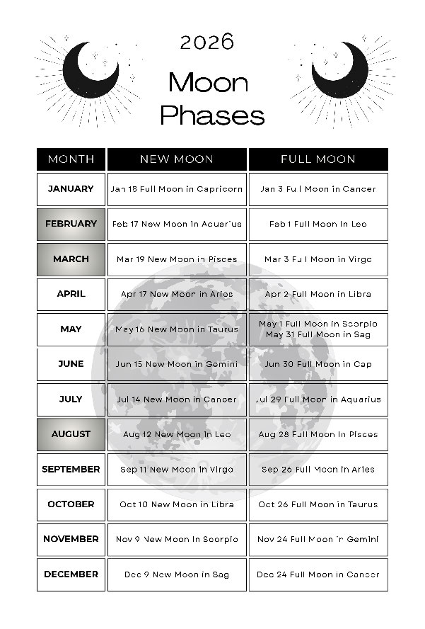 •  Covers 2026 transits and lunar phase info for all major planets plus Chiron